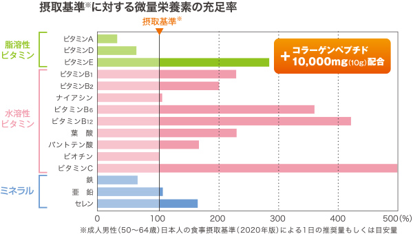 不足しがちなビタミン(12種)と、鉄・亜鉛・セレンなどのミネラルを配合。