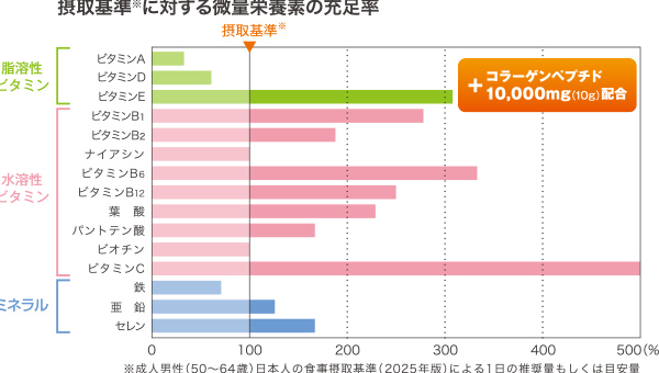 一日の摂取基準※の2~3倍の12種類のビタミンと鉄・亜鉛・セレンなどのミネラルを配合。コエンザイムQ10も同時に補給できます。